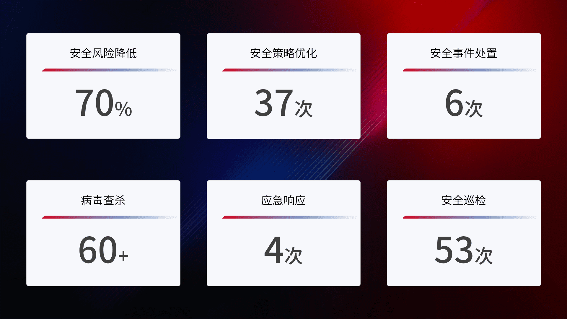 提供全面的安全事件报告体系,,包括处置报告、、、、周报、、、、季度和年度总结,,结合持续监控,,,,帮助客户深入了解网络安全状况。。