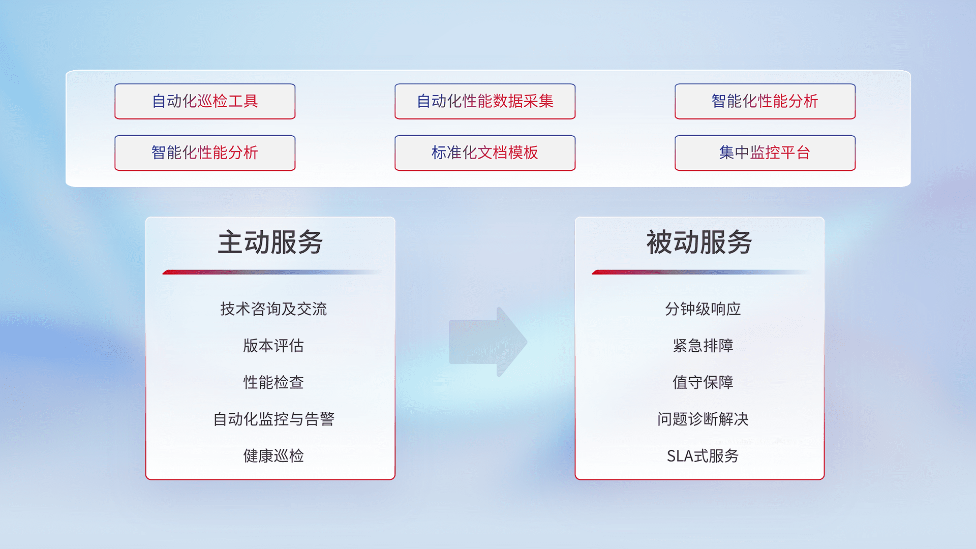 智能化工具和标准化文档,,,,保障服务质量,,,,提供主动服务(包含技术咨询、、、、版本评估、、、性能检查、、、自动化监控与告警、、、健康巡检)和被动服务包含(分钟级响应、、、、紧急排障、、、、值守保障、、、、问题诊断解决、、、SLA服务)。。。。